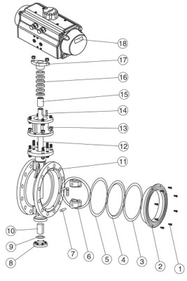 氣動法蘭調節蝶閥默認配AT型雙作用氣動執行機構(選配單作用氣動執行機構),可配電磁閥換向閥(AC220、DC24V、防爆型)、限位開關(閥位反饋、防爆型)、空氣過濾減壓閥(氣源三聯件)